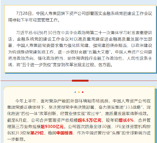 7月28日金融一线消息股票在线配资交易所,中国人寿资产管理有限公司下半年经营管理工作会议信息显示,截至6月底,公司合并管理资产总规模超6.5万亿元,较年初增长6%,合并管理第三方业务规模超9300亿元。